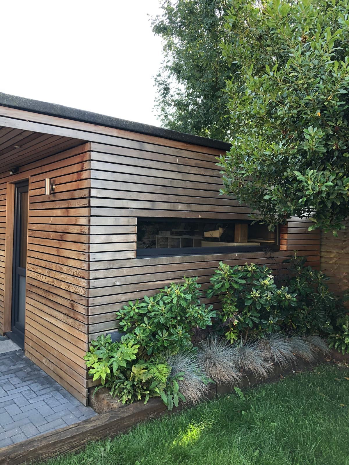 This sleek garden room combines modern design with natural warmth, featuring a striking cedar-clad front that brings character and texture to the outdoor space. The rich tones of the western red cedar soften the clean lines of the structure, allowing it to blend seamlessly into the garden while standing out as a design feature.
