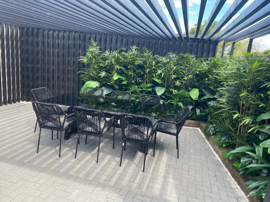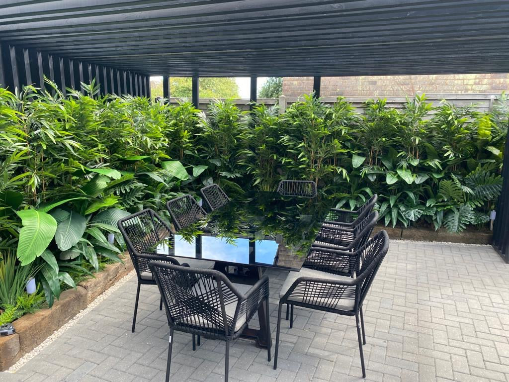 Designed for low-maintenance living and all-season use, this modern garden blends clean lines with clever, enduring style. At its heart is a dedicated dining space, surrounded by high-quality faux plants that offer lush greenery year-round—without the upkeep.