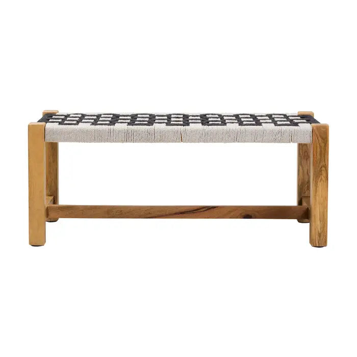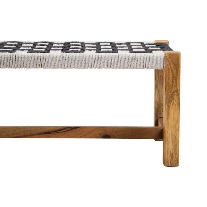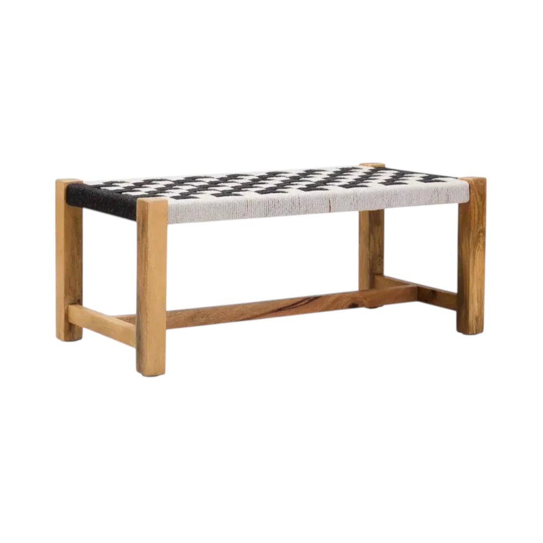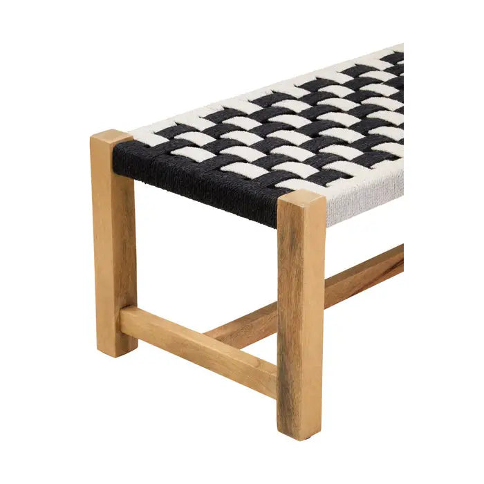 The Aguas bench boasts a black and white woven jute rope pattern supported by a sturdy mango wood frame, offering organic charm and simplicity.