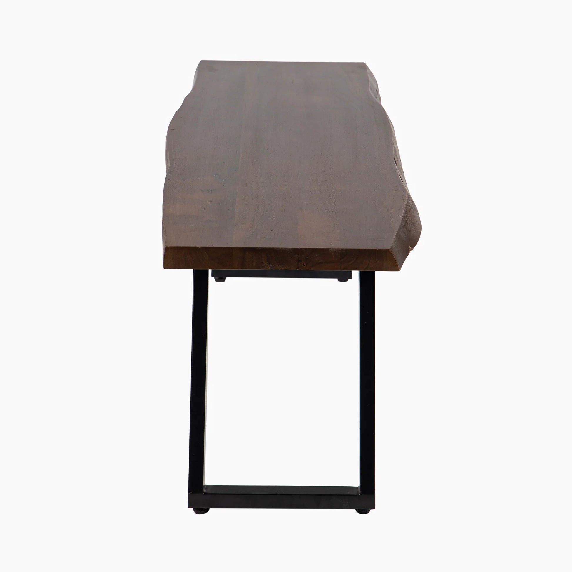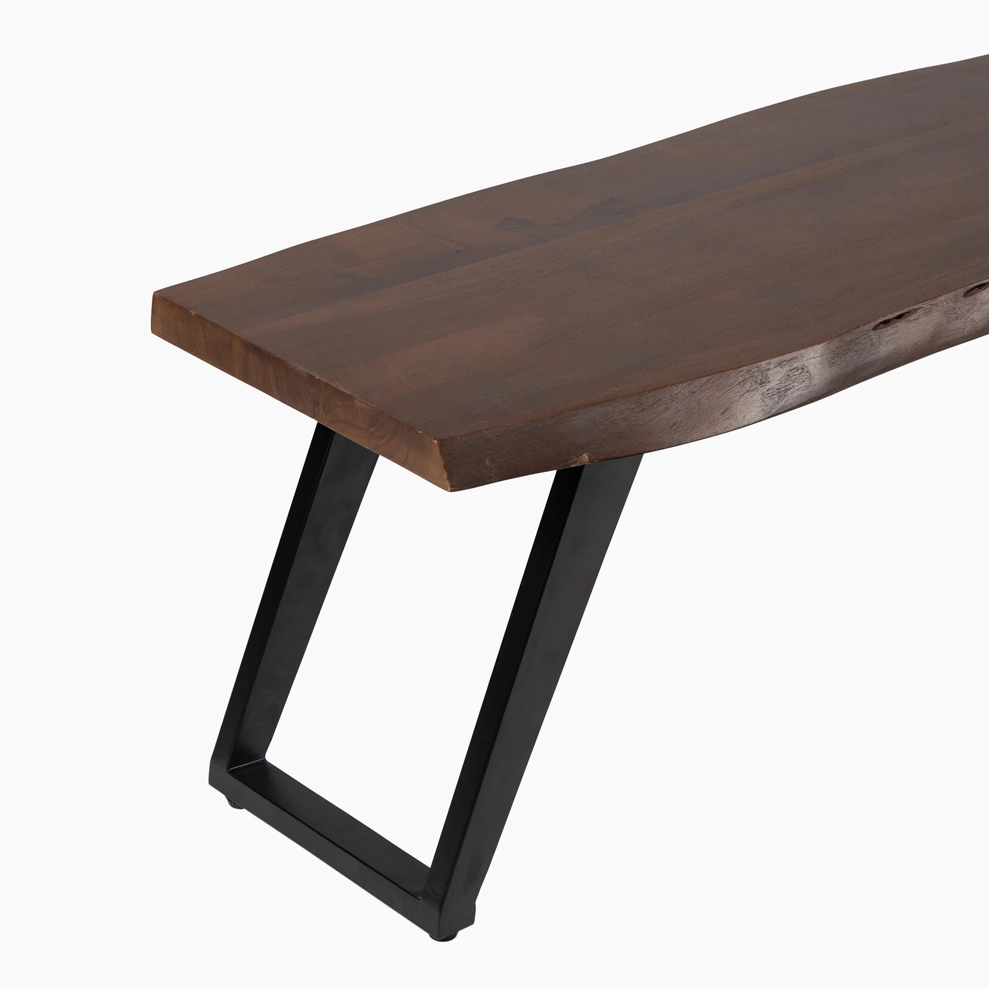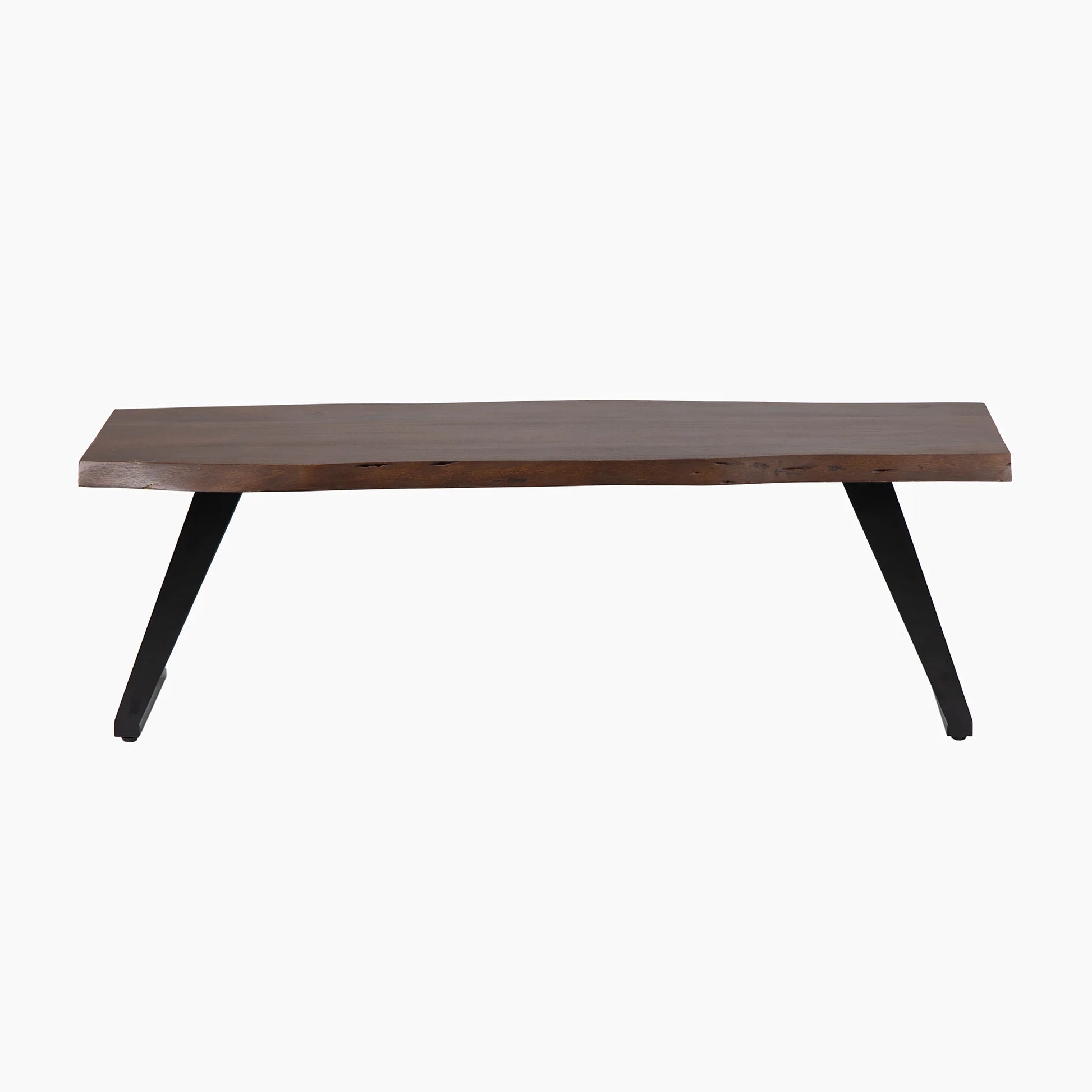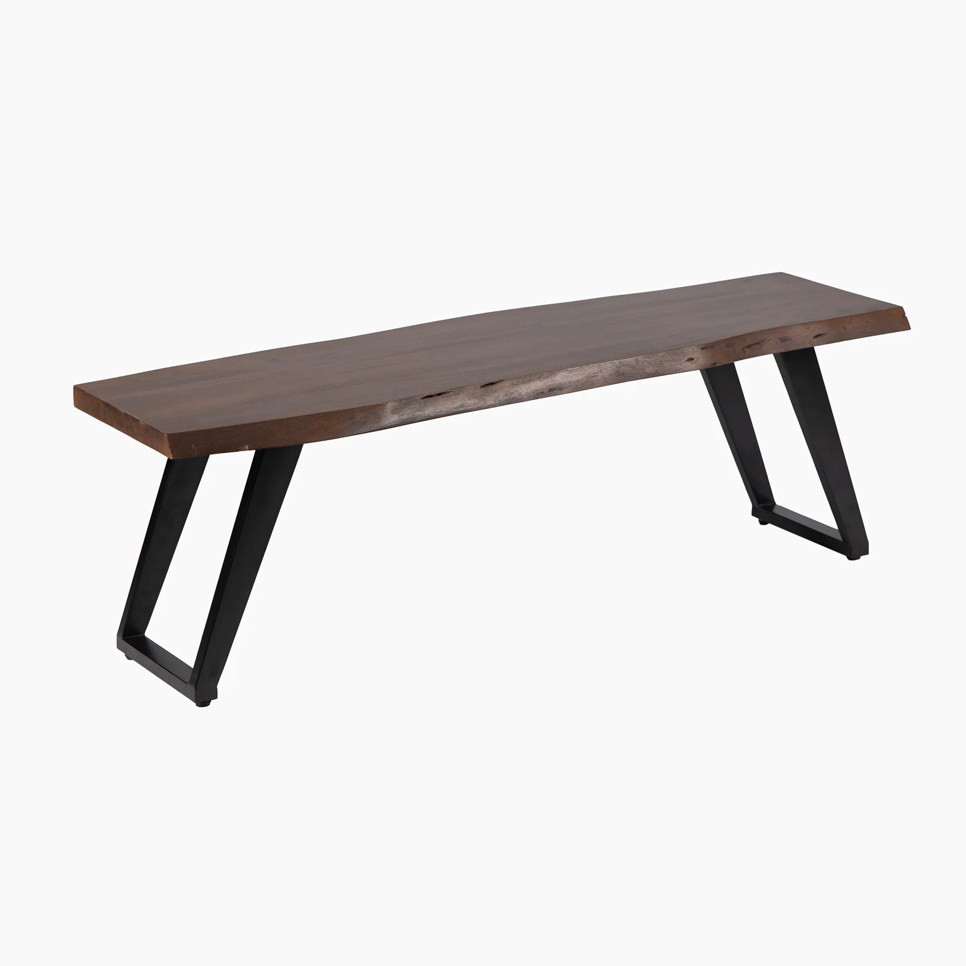 The Bude Bench has a acacia wooden seat with a raw edge in a rich walnut finish, complemented by angular black iron legs that introduce an industrial flair. Its contemporary design make it a versatile addition to various settings, from dining areas to hallways. Perfect for any home, it pairs beautifully with the Bude Dining Table.