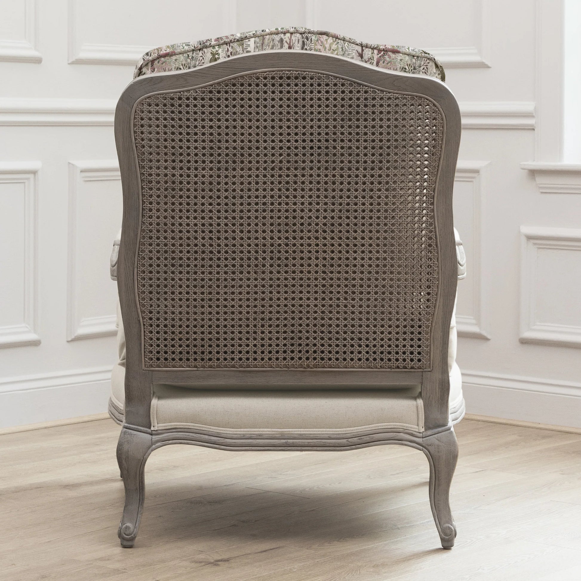 The Chateaux Armchair combines French-inspired elegance with expert craftsmanship. Featuring a beautifully carved washed oak wooden frame with a unique digitally printed back cushion of a Whimsical Tale scene on taupe linen, it offers both style and comfort. The duck and fibre-filled cushions ensure a plush seating experience, while its generous dimensions—77 cm wide, 95 cm high, and 87 cm deep—make it a commanding presence in any room. This armchair is a refined choice for those seeking timeless sophistication and enduring comfort.
