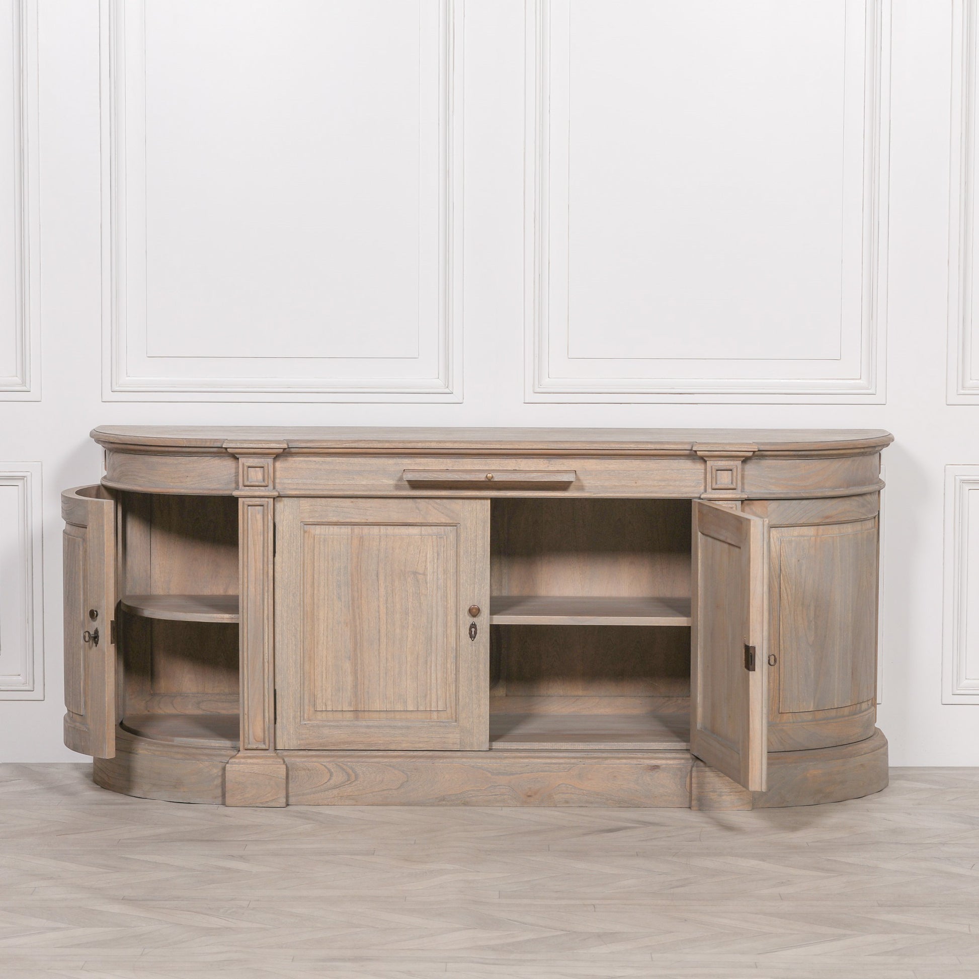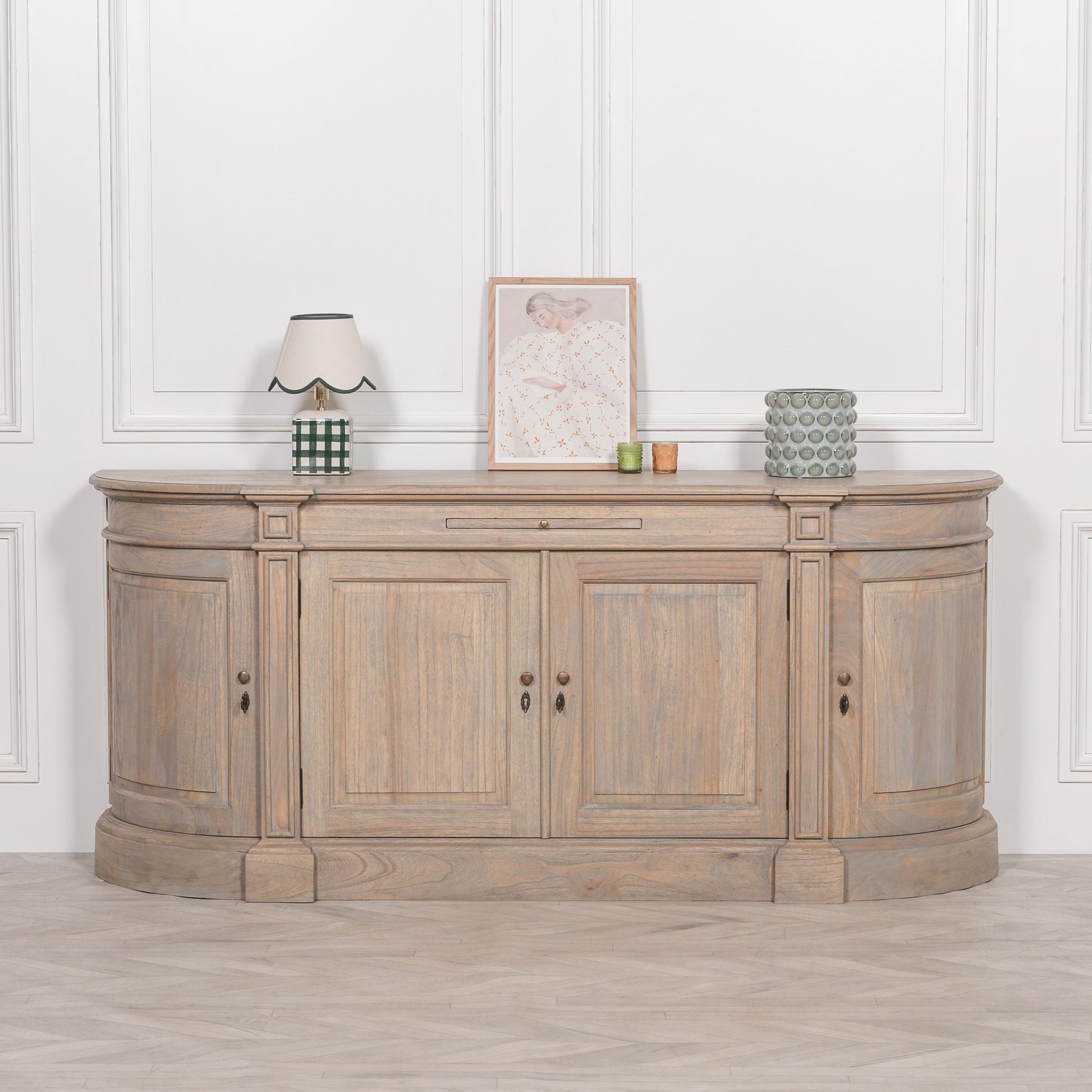 The Christchurch Buffet exudes luxury with its hand-carved intricate design, curved ends, and detailed door fronts. It offers ample storage space with internal shelving and pairs perfectly with the Christchurch console. Crafted from cedar wood with a distressed patina finish. H86 x W195.5 x D51.5.
