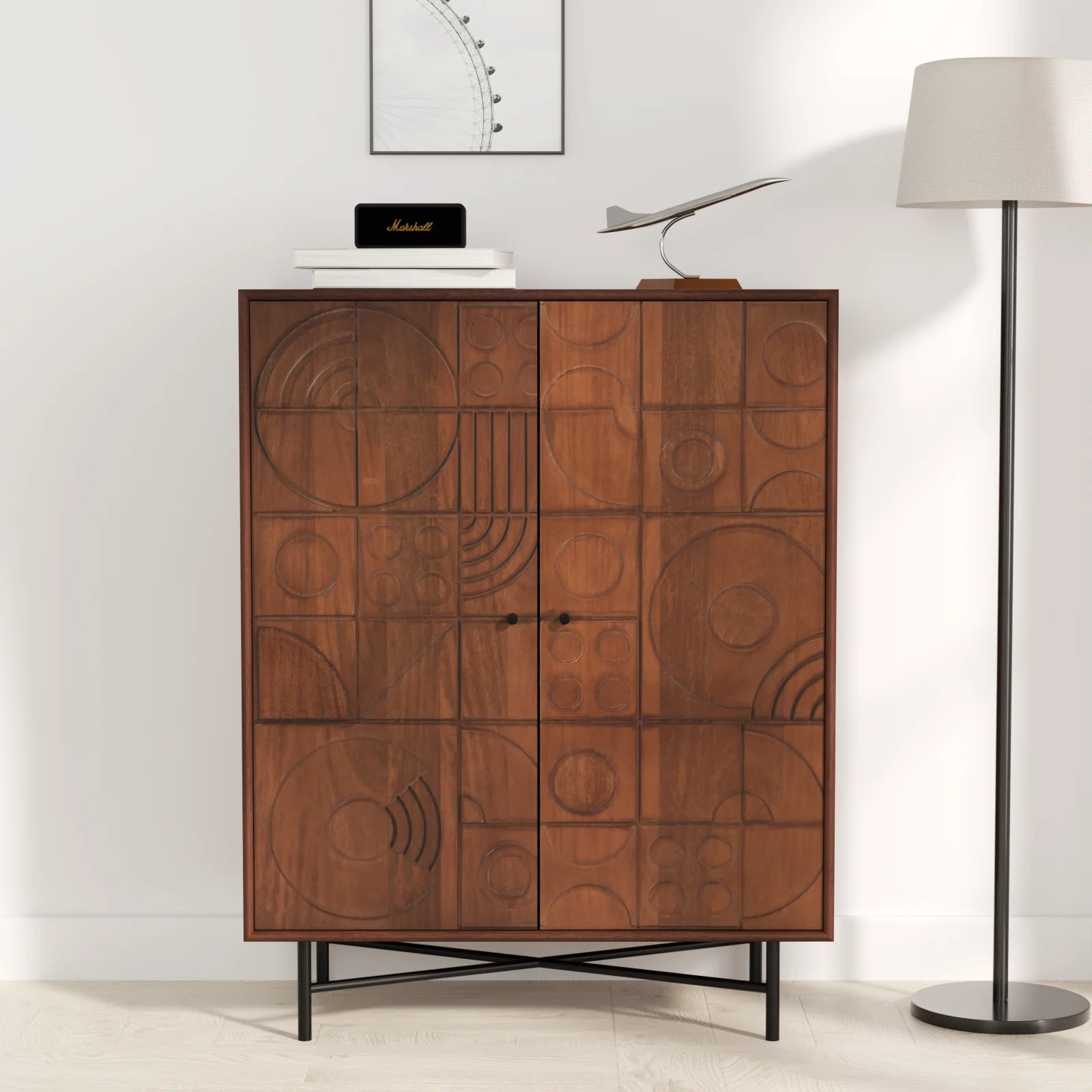 The Curio cabinet is part of our Earth Craft collection that is a masterpiece of style for any space. Crafted from high-quality mango wood in a luxurious mahogany finish, Curio stands elegantly on sleek black-toned iron legs. The front panel features mesmerizing, geometric pattern, while the elegant silhouette exudes a modern, industrial charm. Behind its two artfully designed doors lies generous storage space, ideal as a unique drinks cabinet or as a stand alone storage piece.