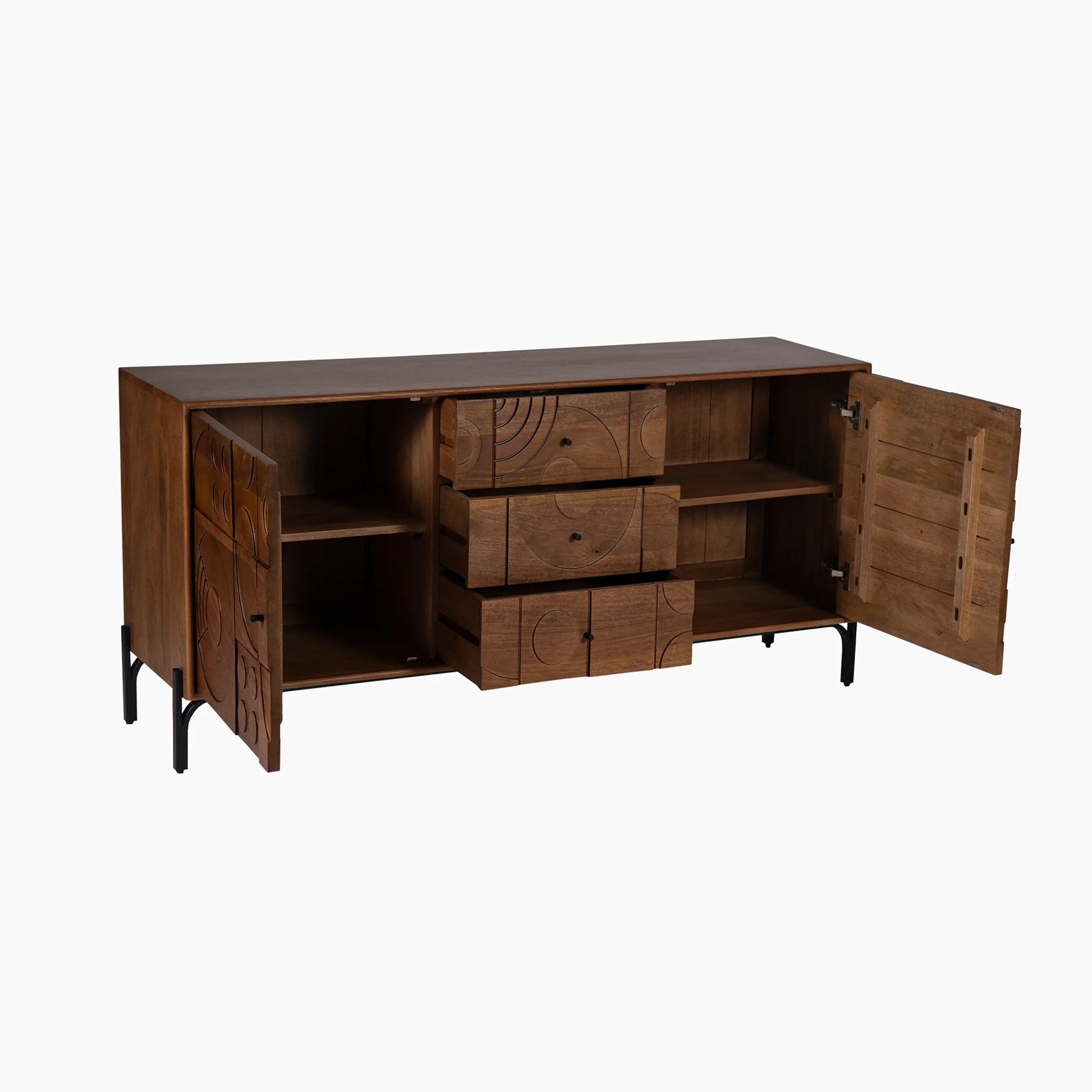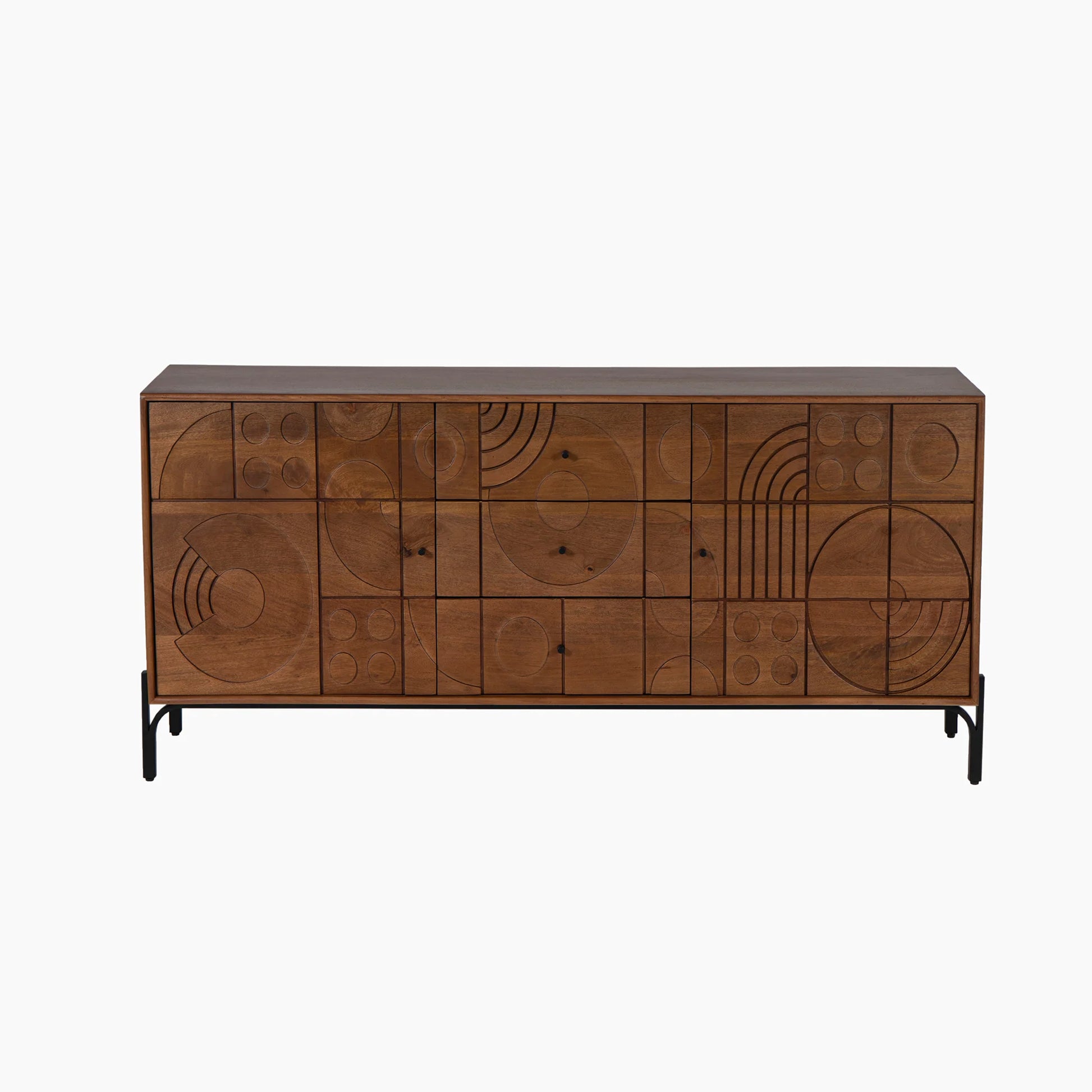 The Curio cabinet is part of our Earth Craft collection that is a masterpiece of style for any space. Crafted from high-quality mango wood in a luxurious mahogany finish, Curio stands elegantly on sleek black-toned iron legs. The front panel features mesmerizing, geometric pattern, while the elegant silhouette exudes a modern, industrial charm. Curio sideboard has 2 cupboards with internal shelves with 3 spacious drawers, with the artfully designed detail.