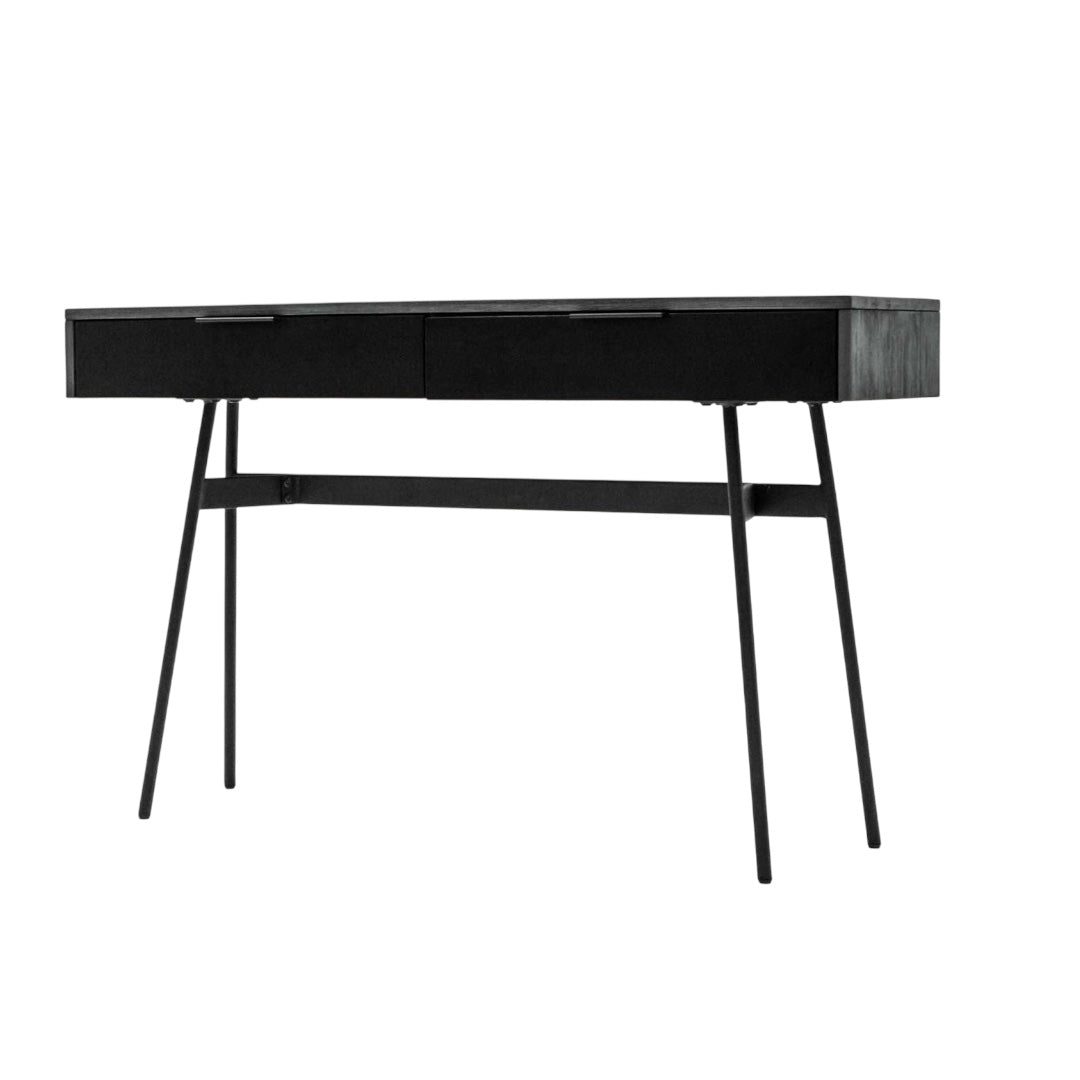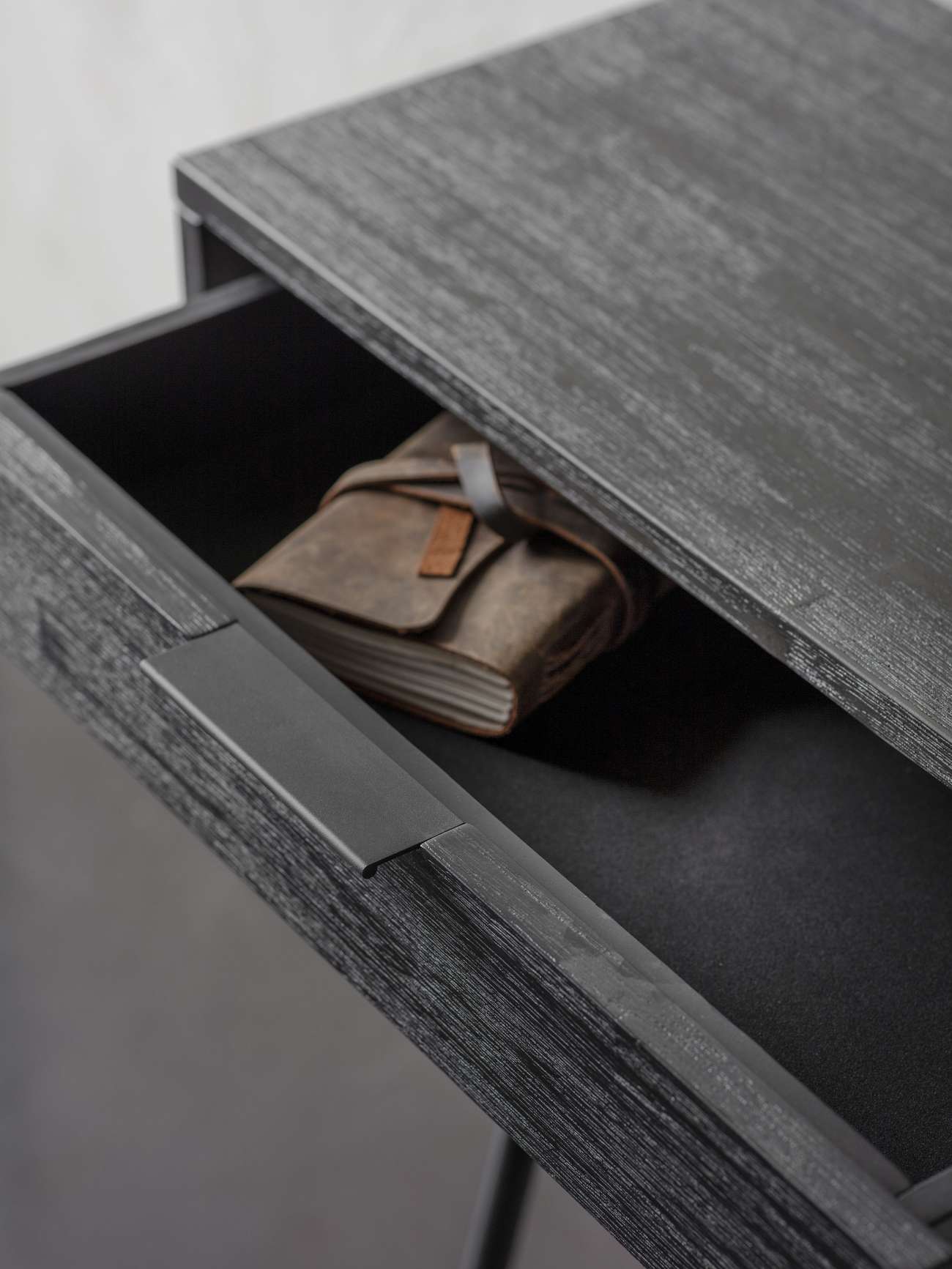 Dury Console has contemporary black powder-coated legs with a grey stain wooden top, effortlessly modern design with timeless elegance. With a sturdy construction and two practical drawers, this table is as functional as it is stylish. Ideal for an entrance hall or use in a bedroom as a smart dressing table.