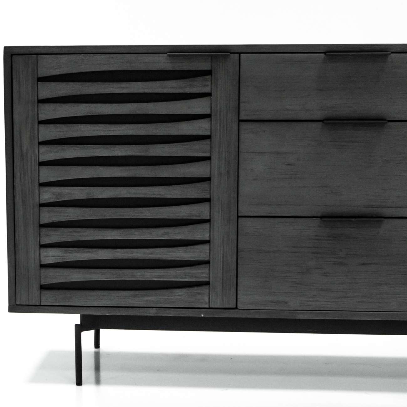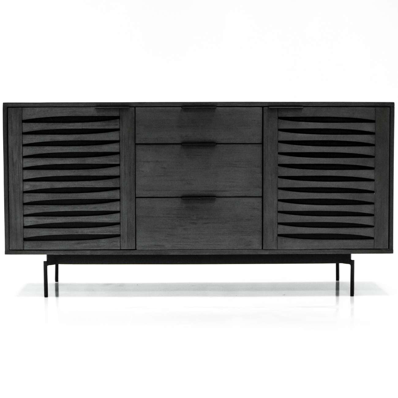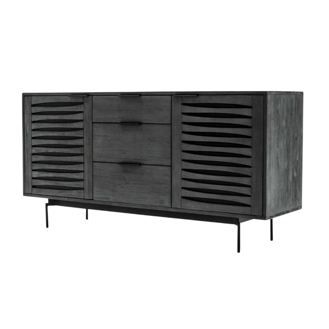 Dury sideboard is crafted from solid Acacia Wood and stained in Tundra Grey with black powder-coated legs and handles. With two doors and three drawers, including an upper drawer lined in black base, it effortlessly combines style with practicality, creating a timeless and elegant addition to your living or dining space.