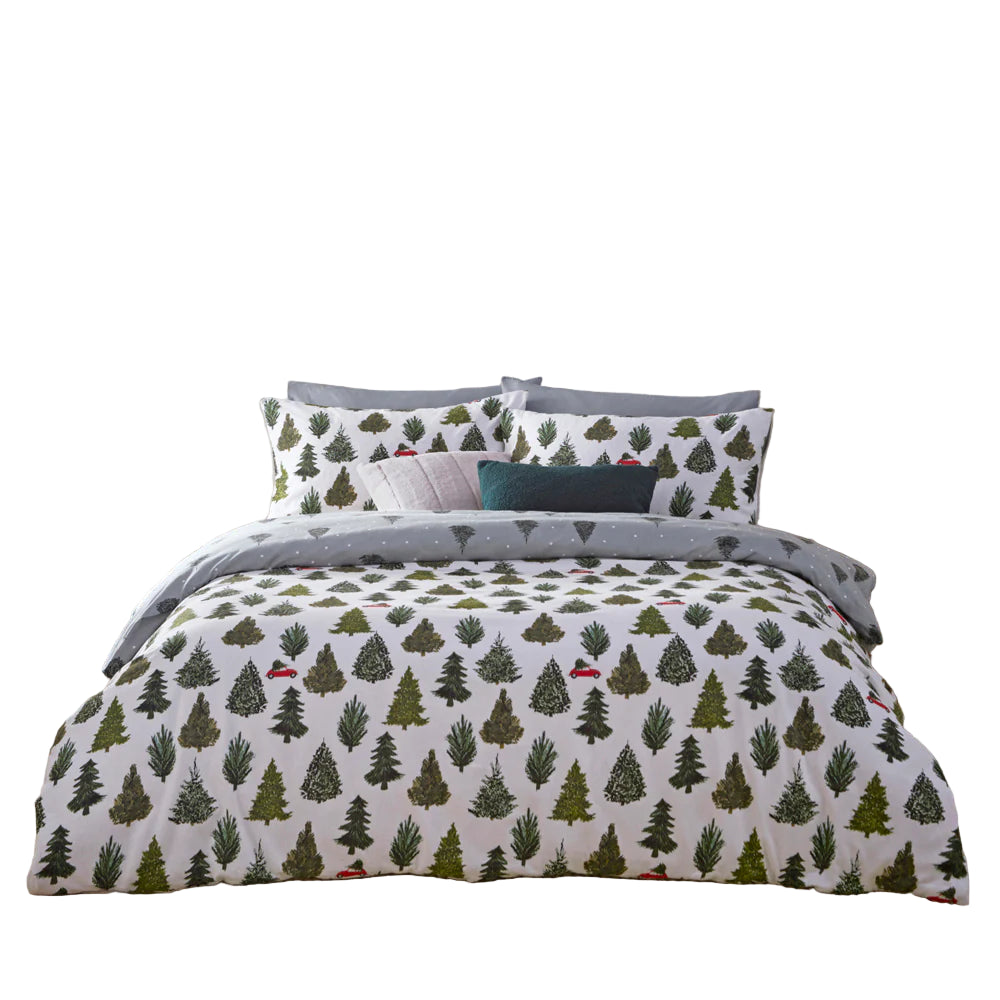 Wrap yourself in cosy charm with the Evergreen Duvet Set! This reversible bedding features soft white brushed cotton adorned with vibrant Evergreen Trees on one side, and a sleek grey brushed cotton with the same design as the other side. Made from 100% cotton with easy button fastening, it’s perfect for refreshing your room’s vibe anytime. Choose your size: single comes with one pillowcase, while double, king, and super king include two pillowcases each. Sweet dreams just got a seasonal upgrade!