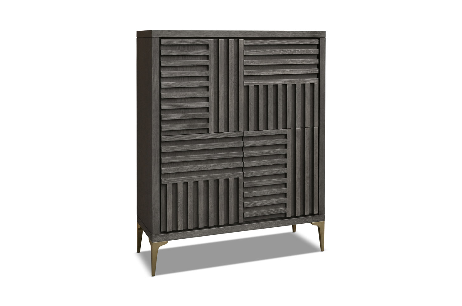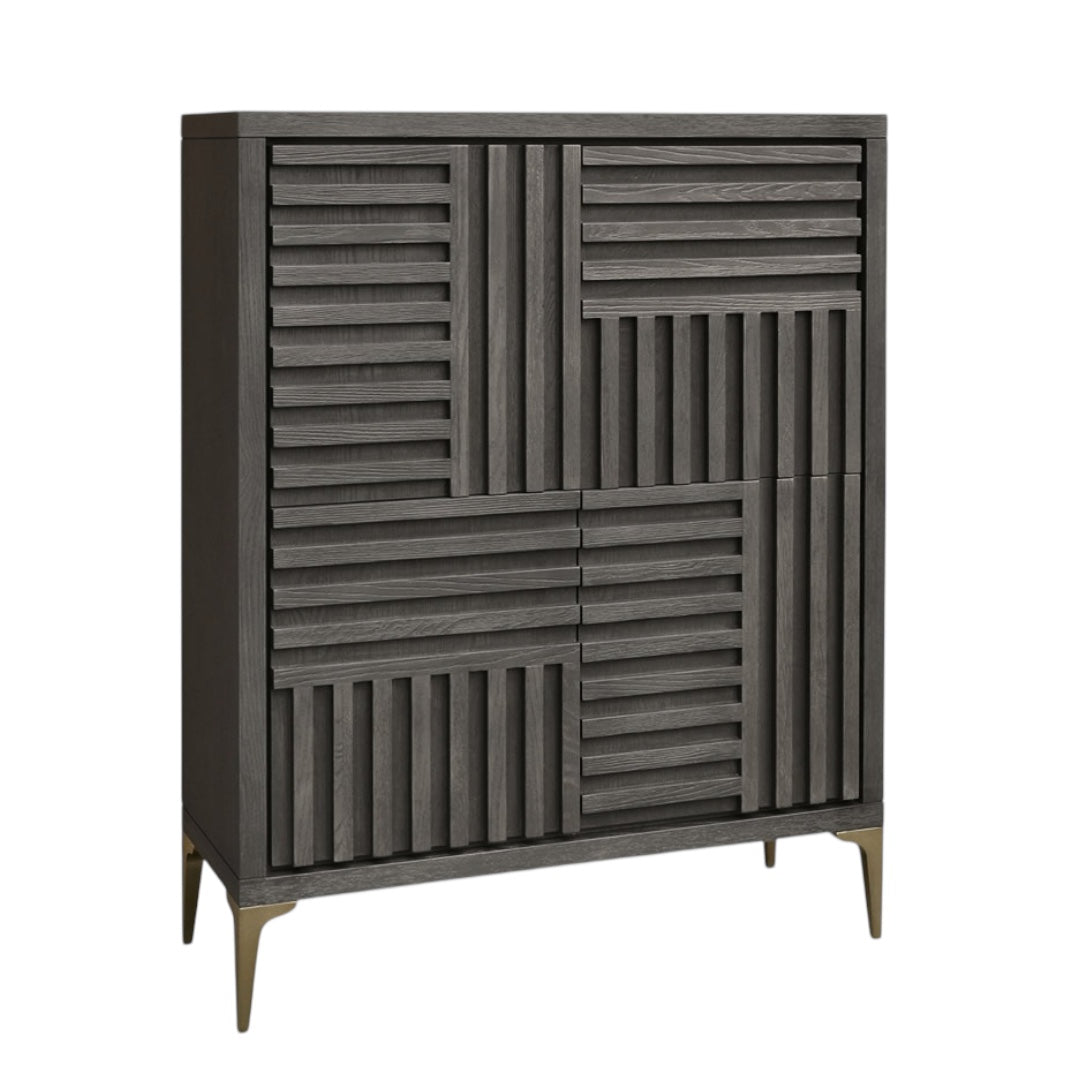 Modern Geometric Cabinet – Charcoal Oak Finish Bring bold sophistication to your space with this Modern Geometric Wood Cabinet, featuring a striking facade of interlocking relief patterns and deep linear textures. Crafted from solid wood in a rich charcoal oak finish, the dynamic front design creates a captivating sense of depth and dimension, making it an instant statement piece in any room.
