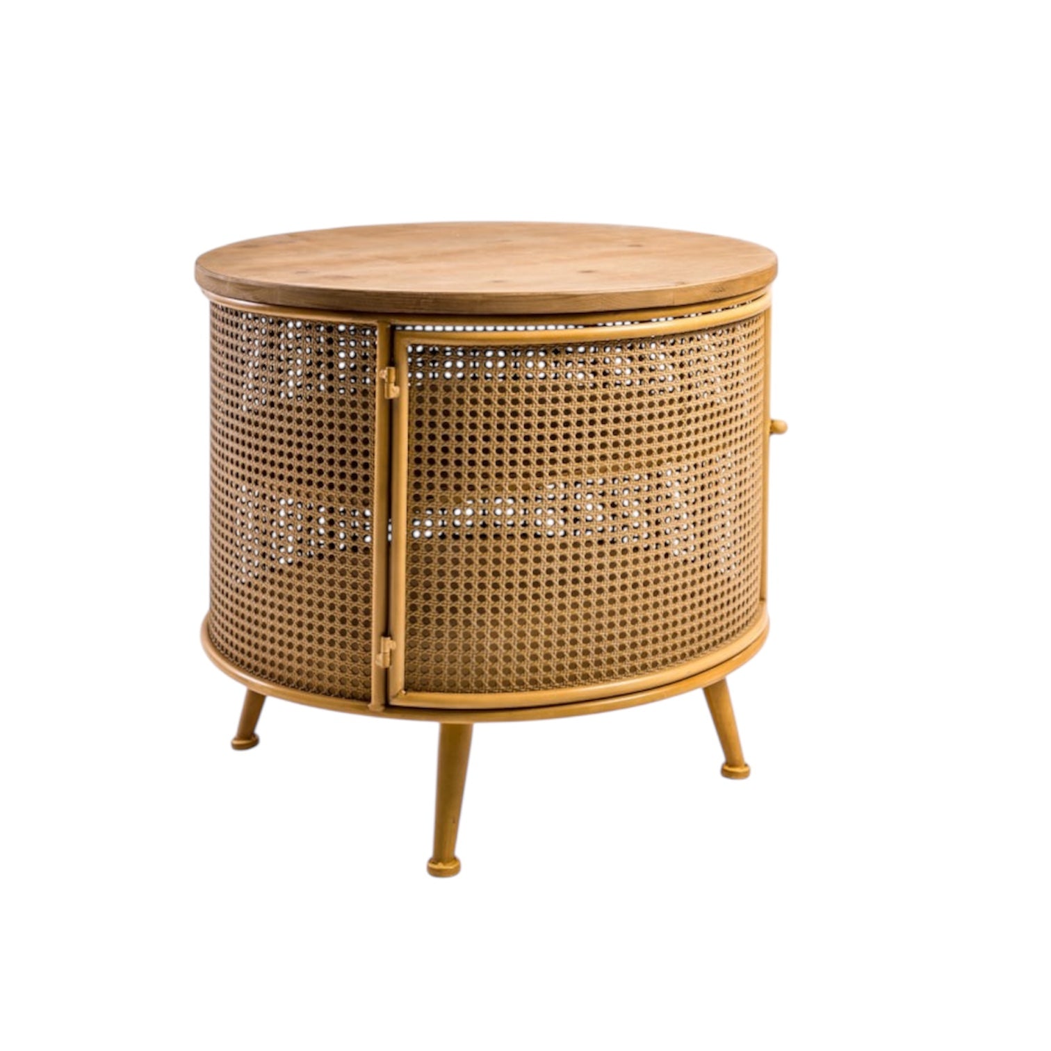 The Hamlet Side Cabinet is a stunning addition to any space, showcasing a unique design that combines metal rattan effect with a circular wooden top. Its elegant appearance is enhanced by a luxurious gold patina finish, making it a true show stopper.