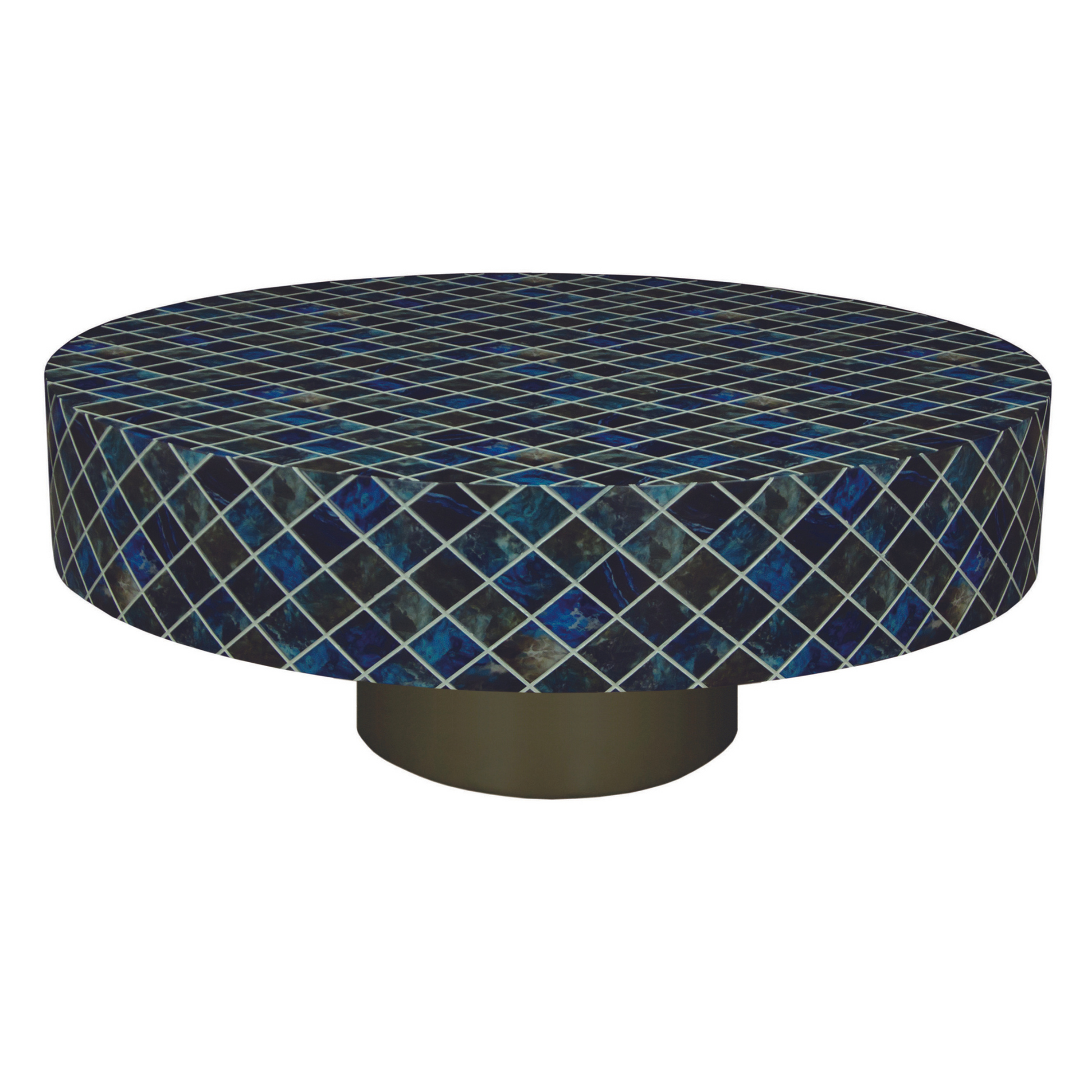 The Harlequin Coffee Table features a low-profile, large circular design with a refined tonal blue tiled effect finish that adds depth and character. Its antique gold contrasting base offers a subtle shimmer, creating a sophisticated statement piece. Measuring 100cm in diameter and 41cm high, this table beautifully combines bold colour and elegant style to enhance any living space with understated luxury.
