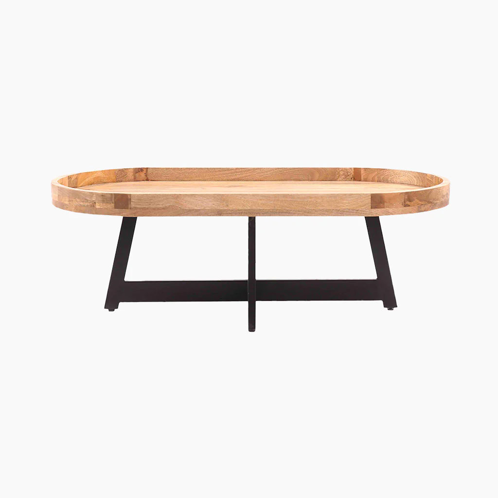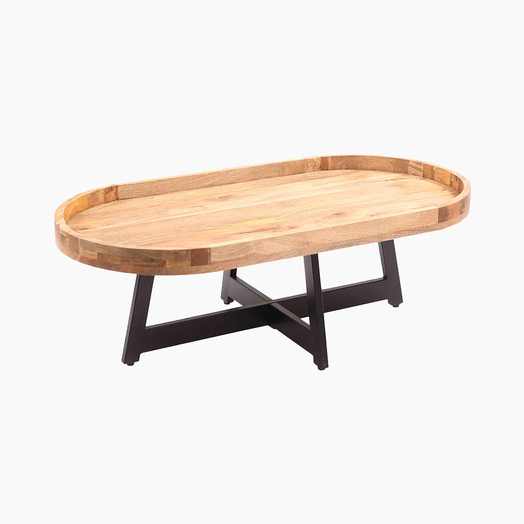 The Hayes coffee table features a chic oval-shaped top crafted from sustainable wood with a rustic natural finish. Its cross-legged wooden base, bearing a sleek black finish, creates a beautiful contrast, making it versatile for different décor styles.
