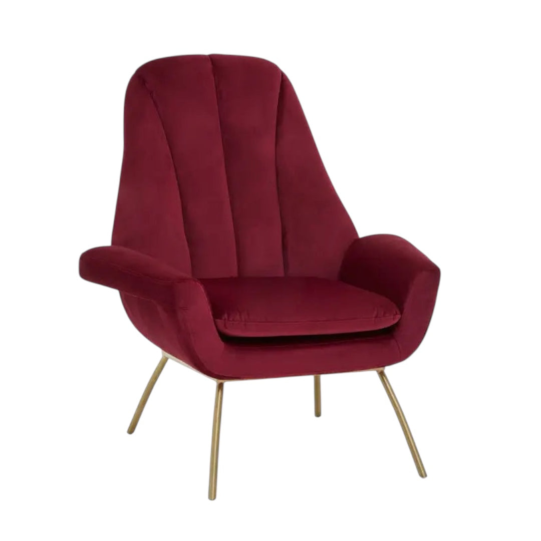 The Host armchair is upholstered in lavish wine velvet, this chair will add a luxe accent to the living room with its plush and sumptuous paddining. Slender gold finish stainless steel legs coordinate with the high back, channel tufted backrest and low armrests for a decorative and modern aesthetic.