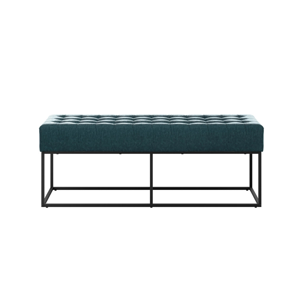 The Hoxton bench with clean lines to the black metal base and soft deep button seat pad makes this the perfect fusion of modern aesthetics and timeless comfort. This versatile piece serves as an ideal addition to any room, providing both functionality and style. Upholstered in teal chenille fabric.