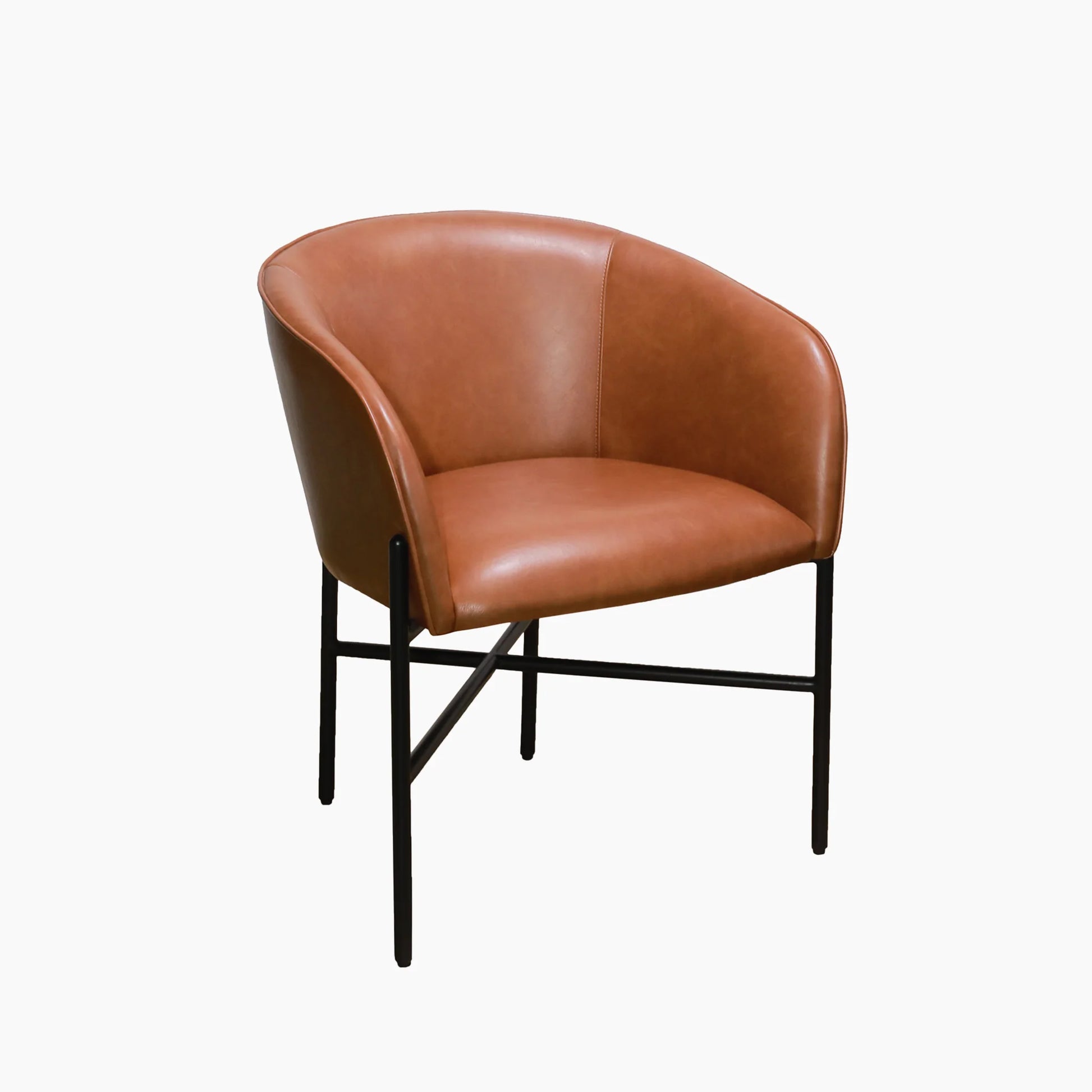The Hugh Dining Chair pairs industrial edge with modern glamour. Upholstered in rich brown faux leather with an ergonomic, cushioned seat and back, it offers comfort with a sleek, tailored look. The black iron frame adds strength and structure, giving Hugh a versatile presence that suits contemporary, eclectic, and industrial spaces alike. An effortless choice for pairing with statement dining tables or layered into loft-style interiors.