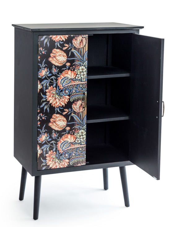 The Raphael Cabinet combines expert craftsmanship with distinctive design, featuring a beautifully painted floral cascade winding around a central column. Inside, a practical internal shelf offers versatile storage, making it both a functional and artistic centrepiece. This unique piece elevates any interior with its elegant detailing and striking presence.